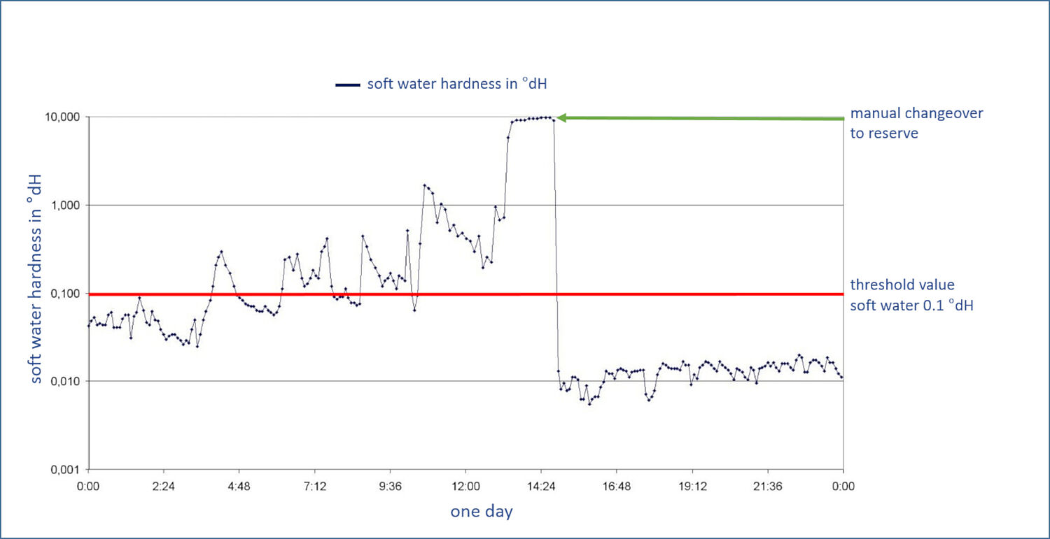 Thus, according to different practical conditions, 20% to 50% fewer regeneration cycles could be achieved when switching from batch to the quality-controlled operation of the water softener. This reduces the costs of regeneration, keeping the amount of soft water constant and the quality of the water high (figure 2).