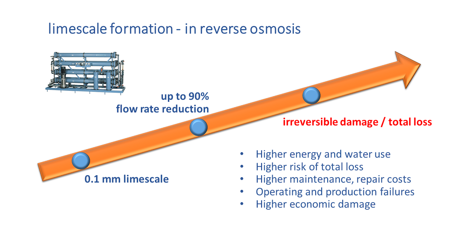 Even a layer of limescale with a thickness of 0.1 mm can lead to a loss of effectiveness of up to 90%. Irreversible damage and total loss are the worst consequences. Until this happens, even the smallest amounts of hard water lead to higher wastewater and reduced permeate. Maintenance and repairs are increasing, up to irreversible membrane losses and complete production downtimes.
